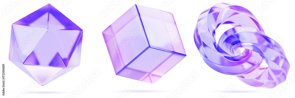 >Fototapety na wymiar>Wybrane motywy - zobacz więcej !>Maki>Glass holographic hexagon, cube and chain of spiral links 3d render icon set. Abstract geometric shape, iridescent gradient figure, purple transparent object, isolated design element. 3D illustration