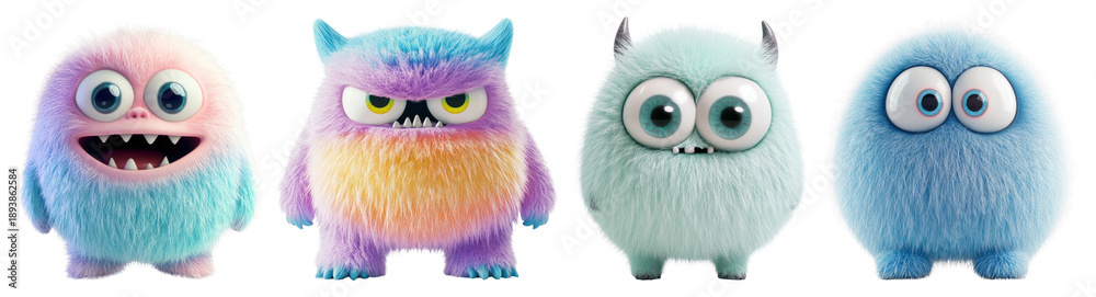 Fototapeta na wymiar - PNG Colorful fluffy cartoon monsters, element set on transparent background.