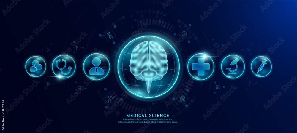 Fototapeta na wymiar - Science medical banner dark blue. Brain hologram in transparent spherical dome along with the icons of a doctor plus sign and syringe. Vector EPS10..