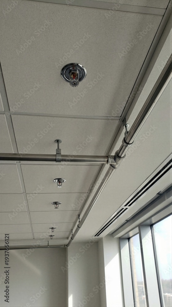 Fototapeta na wymiar - Fire sprinkler system and pipes installed on ceiling of modern building. Urban utility for safety, fire protection..