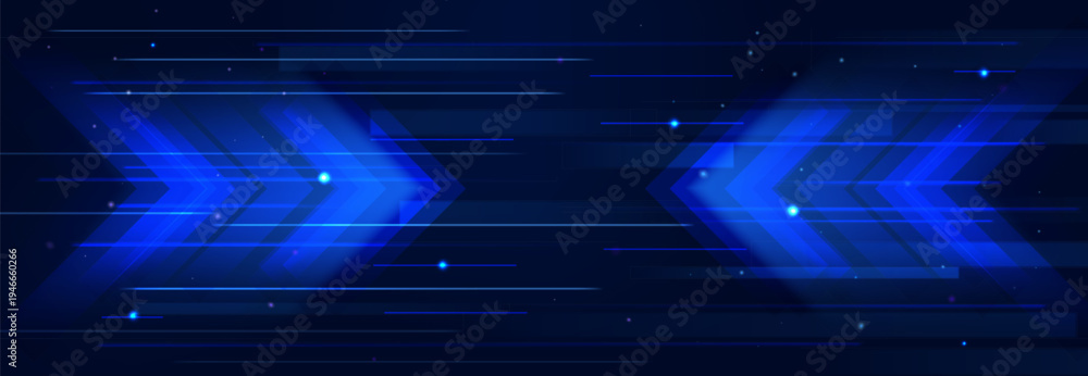 Fototapeta na wymiar - Neon blue arrow with glowing light trails on dark background, 3d abstract vector bg. Dynamic digital speed effect. Futuristic technology glowing arrow concept for web design.