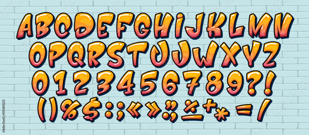 >Fototapety na wymiar>Wybrane motywy - zobacz więcej !>Maki>Street art graffiti font, urban typeface letters of english alphabet vector typography set. Cartoon spray paint abc type on old brick wall texture background. Hip hop graffiti letters and numbers font