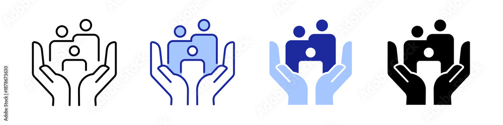Fototapeta na wymiar - Caring hands holding a group of people icon for family, community support and inclusion. Four different style icon collection.