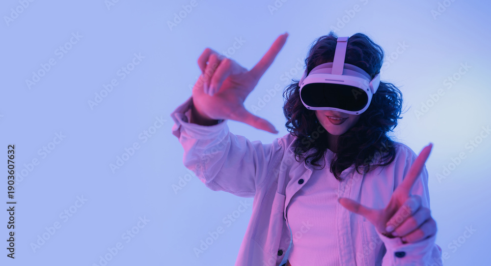 Fototapeta na wymiar - Concept modern immersive digitalization and technology. Young asian female enjoying virtual reality experience with headset.