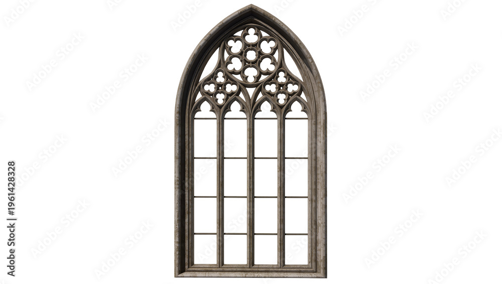 Fototapeta na wymiar - Ornate gothic arched window frame with trefoil detailing, beautifully rendered isolated on transparent background for architectural designs.