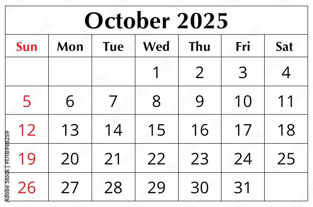 Fototapeta na wymiar - October 2025 ENGLISH month calendar. png transparent illustration.