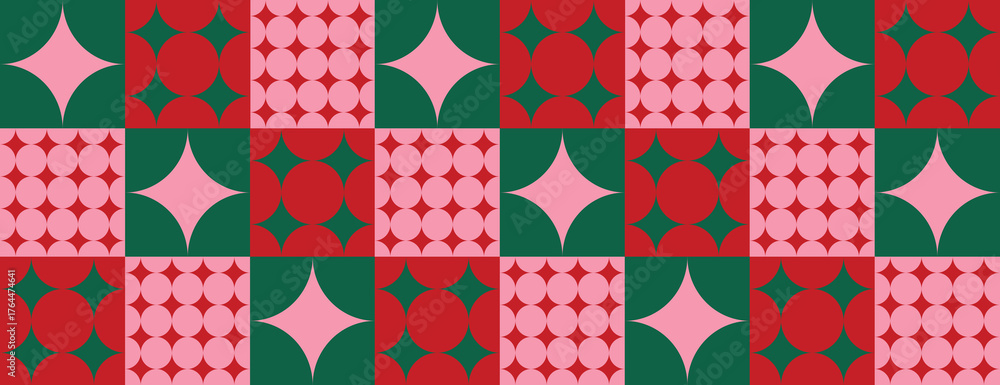 Fototapeta na wymiar - Geometric background with red and green squares. The background features pink star patterns, creating a vibrant, festive texture. Minimal retro geometric star pattern vector background.