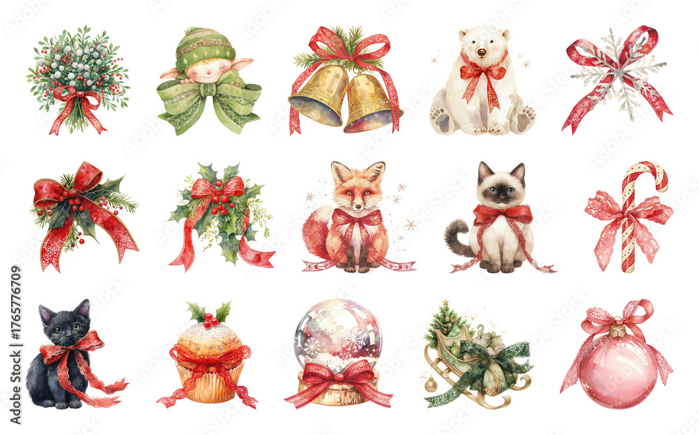 Fototapeta na wymiar - PNG Charming festive watercolor illustrations, element set on transparent background.