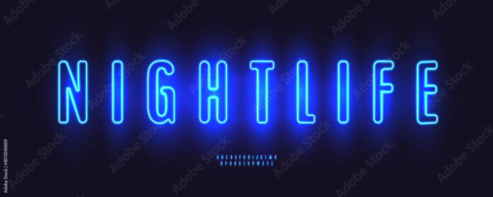 Fototapeta na wymiar - Glow Neon Blue Font Logo Alphabet Vector Condensed Letters Set Modern Typography, Glowing Typographic Design for Sign Title Text, Typo Poster Headline, Led Contour Sans Serif Fonts. Vector Typeface.
