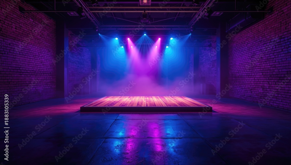Fototapeta na wymiar - Dance performance in a garage studio featuring vibrant spotlights, aged brick backdrop, and an industrial setting.