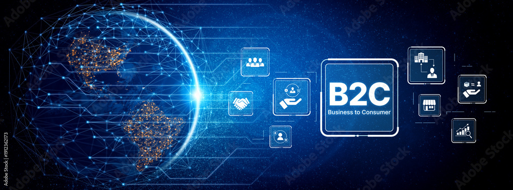 Fototapeta na wymiar - B2C strategy focus on delivery products directly to consumer. Successful B2C model enhance consumer engagement, streamline B2C logistics, and boost consumer satisfaction through digital retail. Spline.