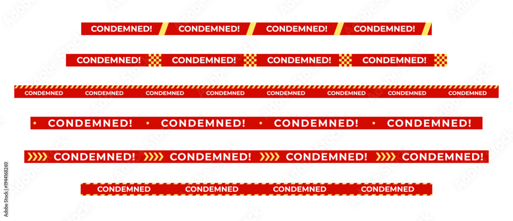 Fototapeta na wymiar - Condemned warning tape set, red yellow barrier strips with CONDEMNED text for demolition, quarantine, restricted zones. Condemned tapes and signs for safety design. Vector illustration..