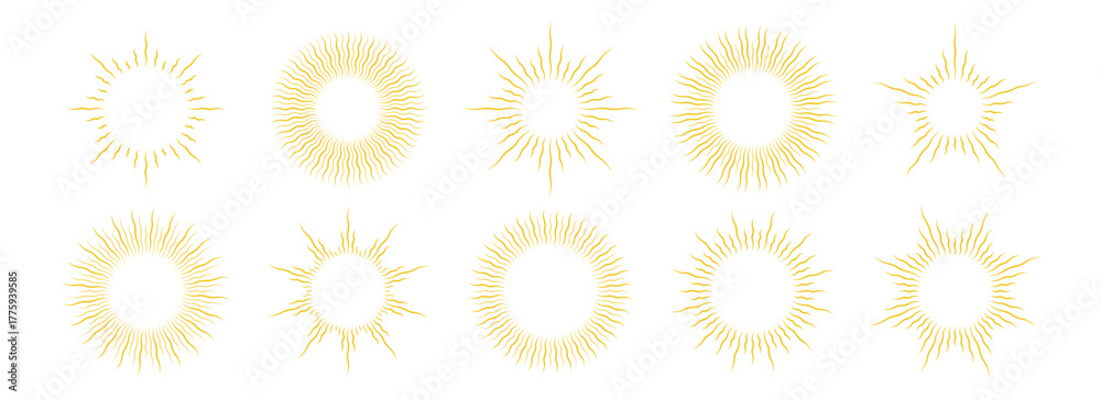 Fototapeta na wymiar - Gold wavy sunburst frame set. Golden curly radial sun light border collection. Vintage royal sun beams or rays pack for cadre, decor, label, badge, emblem. Vector yellow retro round boarder bundle.