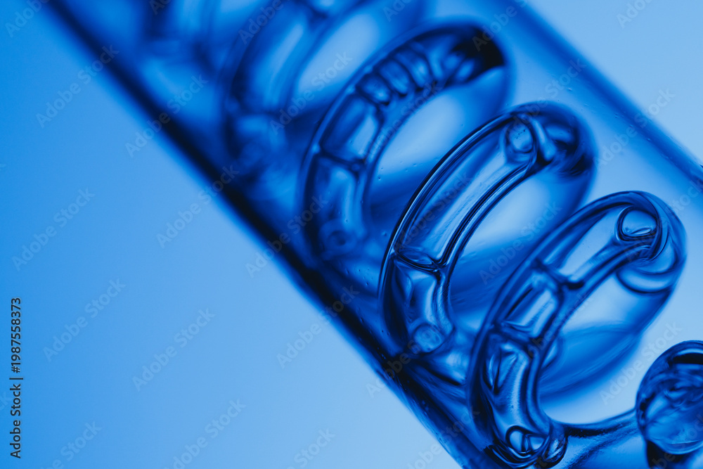 Fototapeta na wymiar - Macro view of Transparent glass spiral in blue with air bubbles for abstract laboratory background.