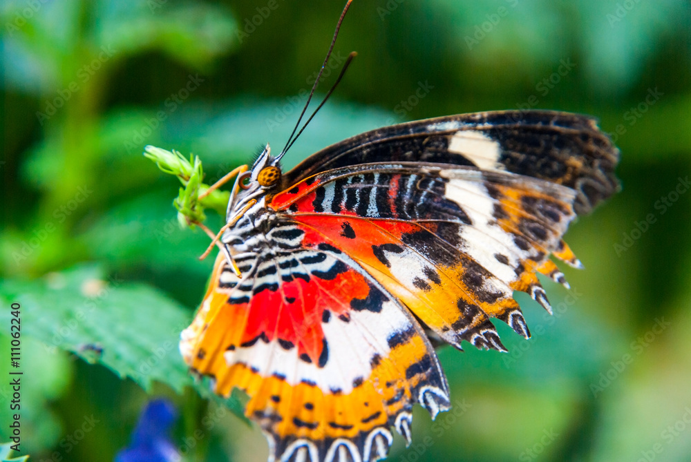 Fototapeta na wymiar - Close-up of butterfly sitting on green leaf.