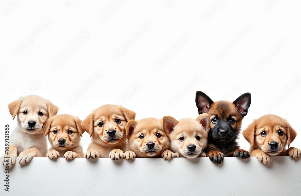 Fototapeta na wymiar - Group of adorable puppies, kittens peek over white banner. Perfect for pet store ads, vet clinics, animal adoption promotions. Blank space for text invites commercial use. Cute animals pose together..