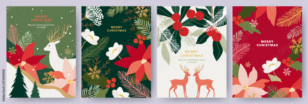 Fototapeta na wymiar - Merry Christmas greeting card Set. Modern beautiful Xmas design with hand drawn Poinsettia flowers, holly berries, fir branches, snowflakes, deer and typography. Art banner, poster, cover templates..