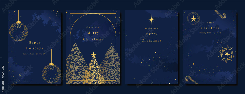 Fototapeta na wymiar - Christmas Luxury gold invitation card design vector. Christmas pine leaves, snowflake with gold foil and spot texture on navy blue background. Design illustration for cover, print, poster, ads..