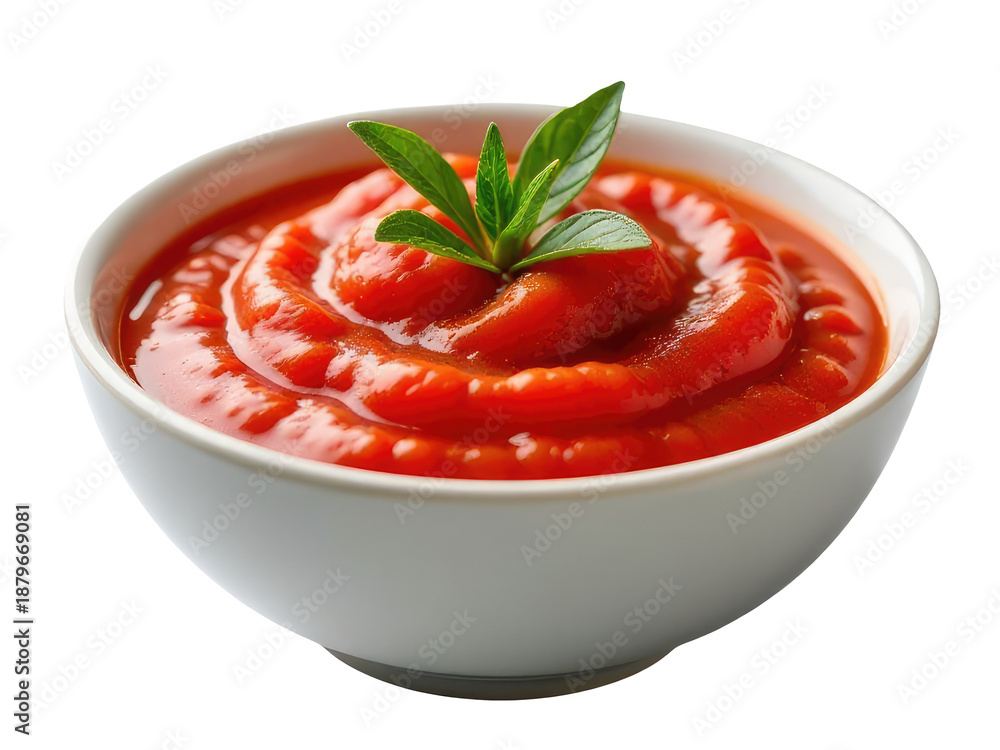 Fototapeta na wymiar - Fresh tomato sauce served with a sprig of basil, perfect for pasta dishes or as a dipping sauce.