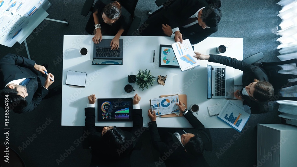 Fototapeta na wymiar - Top down aerial view of manager standing and present marketing plan to skilled investor. Diverse business team working together to analyze financial statistic graph at meeting table. Directorate..