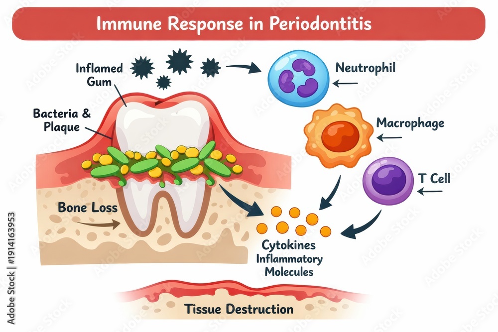 Fototapeta na wymiar - The immune response involved in periodontitis. It highlights bacteria, inflammation, and immune cells in the gums..
