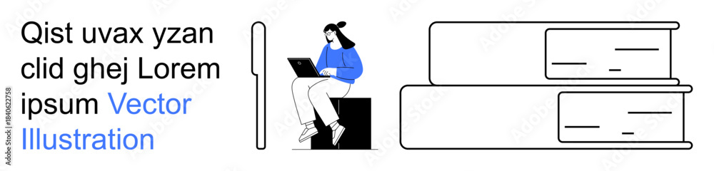 Fototapeta na wymiar - Education, e-learning, knowledge, remote work, technology, study habits. Woman sitting with a laptop beside stacked books. Education and e-learning visualization.