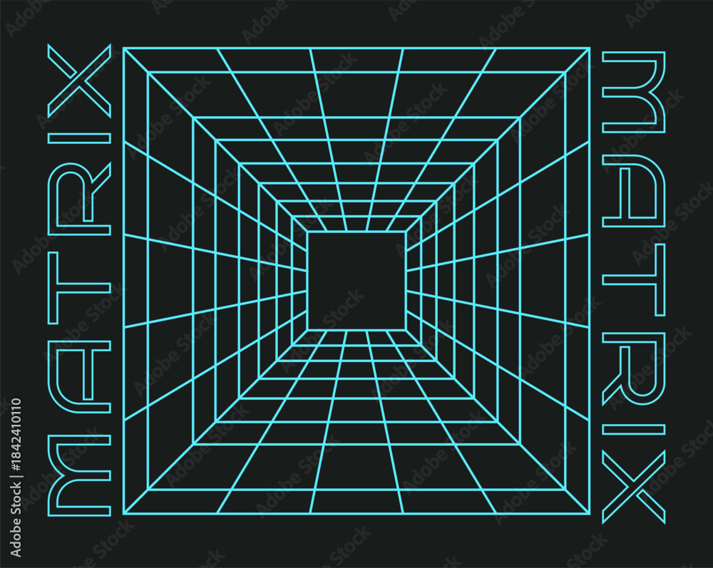 >Fototapety na wymiar>Wybrane motywy - zobacz więcej !>New York>Grid element. Waveform at display. Matrix perspective hole. Tech square mesh lines. Geometric tunnel. Retrowave room. Neon futuristic 3D net. Digital technology for cyberspace. Vector cyber banner