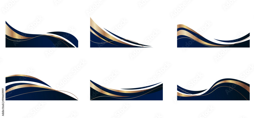 Fototapeta na wymiar - Elegant gold wave design with flowing curves and decorative corner elements, abstract vector background set. Luxury blue and golden borders for certificates, invitations, and premium frame templates.