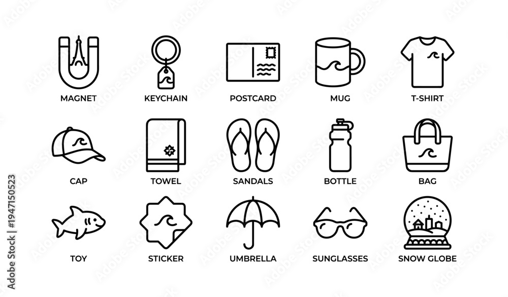 Fototapeta na wymiar - Icon set of vacation souvenirs including magnet, keychain, t-shirt, mug, and more.