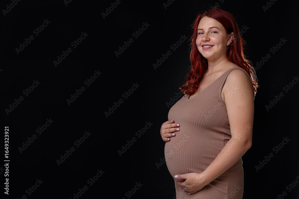 Fototapeta na wymiar - Beautiful pregnant woman on black background, space for text.