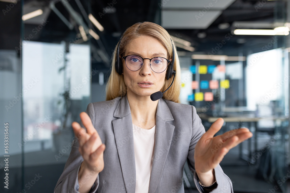 Fototapeta na wymiar - Businesswoman in headset talking during online video call via webcam.