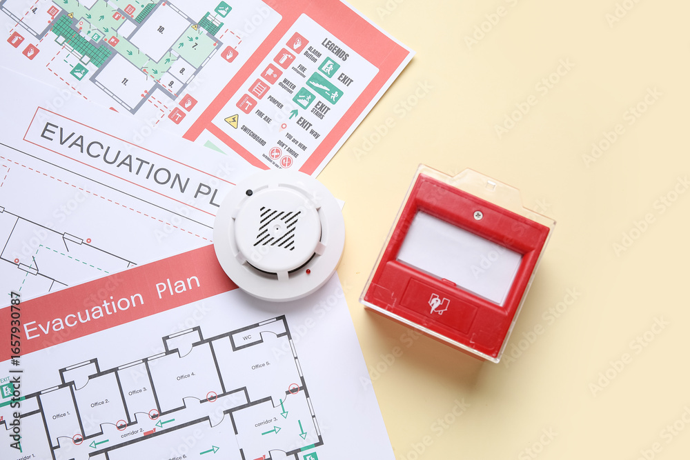 Fototapeta na wymiar - Modern smoke detector with evacuation plans and fire call point on yellow background.