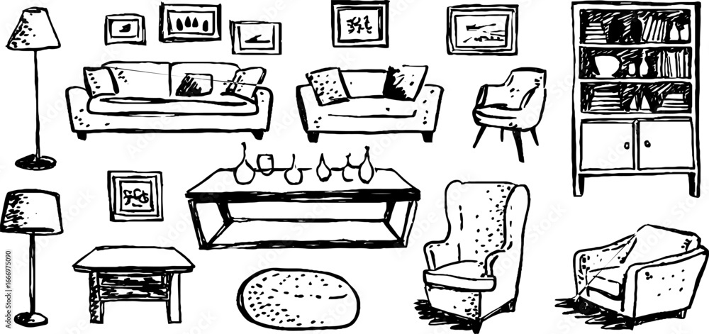 Fototapeta na wymiar - Set of hand drawn decorative sofas and furniture with cushions for interior design inspiration.