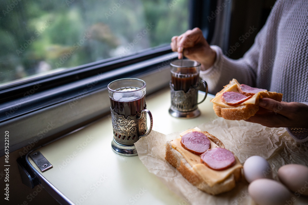 Fototapeta na wymiar - Passenger have lunch in train car by window, travel snack on table. Train meal and tea in glass holder, sandwich lunch in travel, slow living and comfortable journey, onboard snack, window seat.
