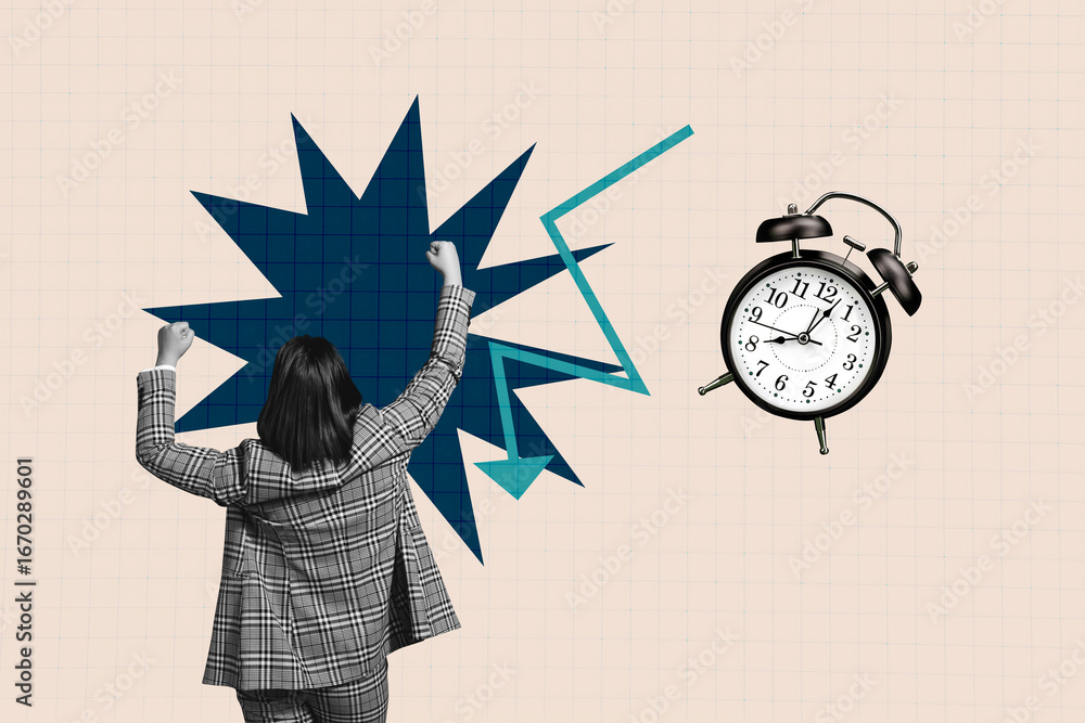 Fototapeta na wymiar - Successful freelancer celebrating financial growth working remotely computer desk laptop in creative collage style concept.