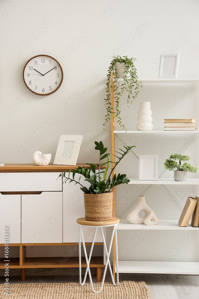 Fototapeta na wymiar - Interior of light room with wall clock, commode and shelf unit.