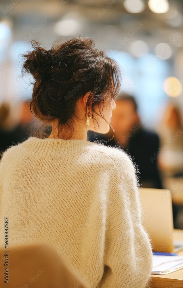 Fototapeta na wymiar - Businesswoman sitting at desk listening during conference meeting.