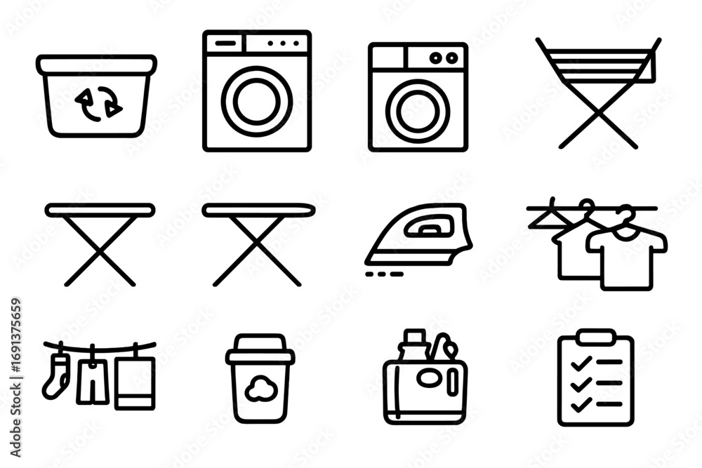 Fototapeta na wymiar - Laundry Workflow Icons. Outline icon set of laundry workflow zones: sorting bin, washing machine, tumble dryer, drying rack,.