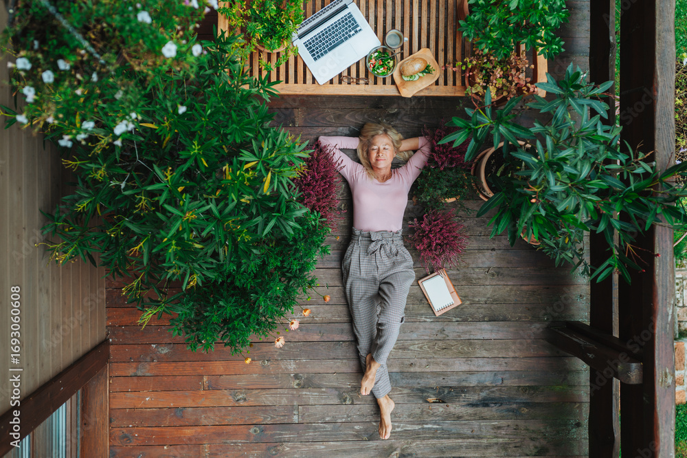 Fototapeta na wymiar - Tpp view of older woman working from homeoffice, lying on wooden patio..