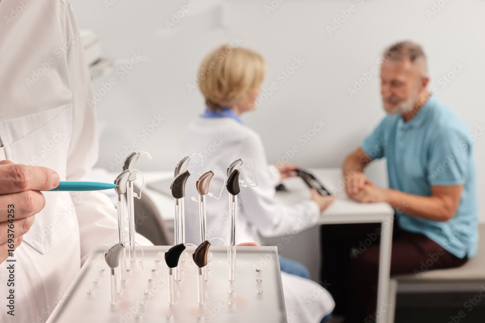 Fototapeta na wymiar - Doctor audiologist showing display stand with BTE hearing aids different types or colors while patient consultation. Hearing aids and solutions.