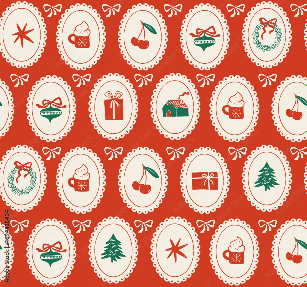 Fototapeta na wymiar - Christmas pattern. Seamless pattern with frames, Xmas tree, gift, stars, cherry elements.