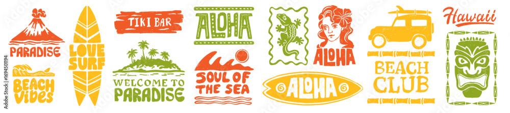 >Fototapety na wymiar>Wybrane motywy - zobacz więcej !>Niedźwiedź>Aloha Hawaii logo set, vector hand drawn summer badge, tropical ocean beach print design, surfboard. Exotic coastal vacation sticker, paradise island calligraphy design elements. Aloha Hawaii icon