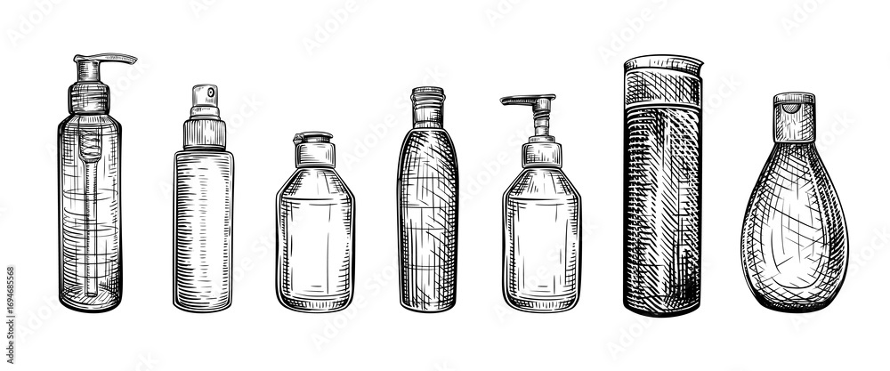 >Fototapety na wymiar>Wybrane motywy - zobacz więcej !>Niedźwiedź>Vector hand drawn vintage illustration of cosmetic bottles in vintage engraved style. Package for shampoo, cream, tonic, lotion, serum. Black and white sketch isolated on white background