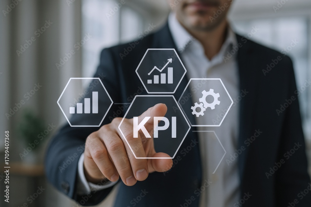 Fototapeta na wymiar - Businessman Analyzing Key Performance Indicators (KPIs) on a Digital Interface for Business Growth and Success.