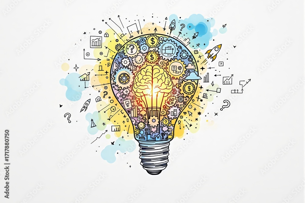 Fototapeta na wymiar - Innovative business concept illustration with brain and lightbulb symbolizing creativity and strategy on white background with colorful elements. Ai generative.