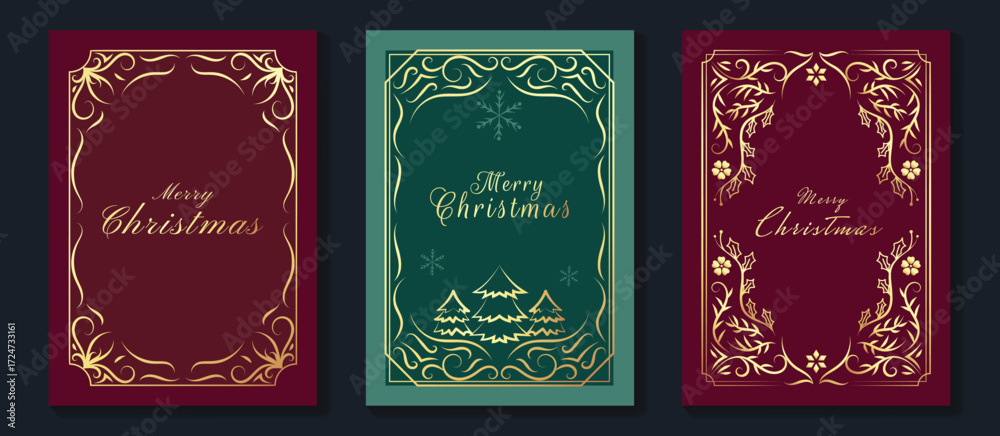 Fototapeta na wymiar - Christmas and Happy Holidays poster vector set. Luxury card template with Victoria frame, christmas tree and ornament vintage border on red and green background. Design for cover, poster, packaging..