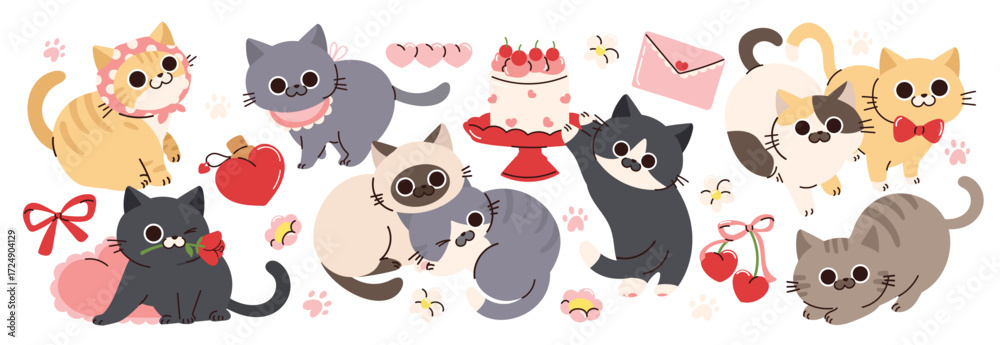 Fototapeta na wymiar - Cute cat doodle in happy valentine's festival vector set. Cartoon cat or kitten characters design collection in different poses and element. Set of love event pet animals isolated on white background..