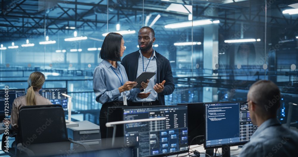 >Fototapety na wymiar>Wybrane motywy - zobacz więcej !>Niedźwiedź>Male DevOps Engineer and Female IT Consultant Using a Tablet Computer, Standing in an Office Above the Rows of Servers in a Data Center, Developing Automation Scripts for Artificial Intelligence