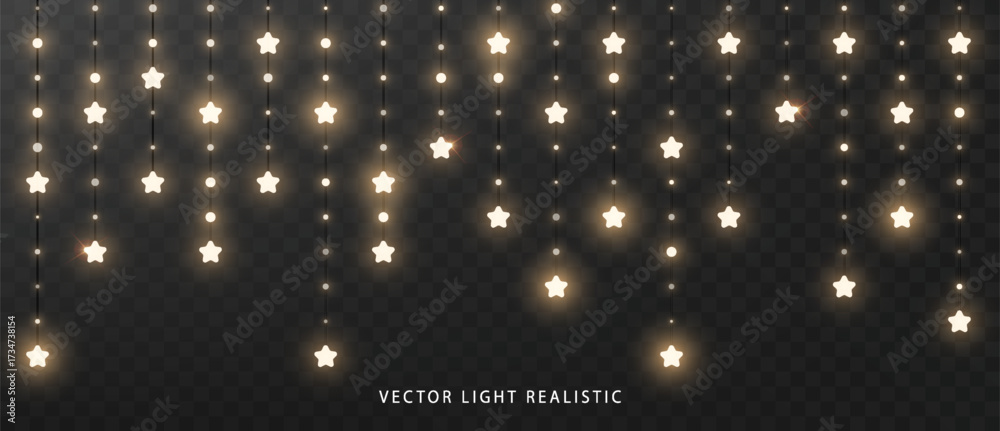Fototapeta na wymiar - Holiday star shiny lights garland. Realistic glowing bulbs vertical decor isolated on dark.