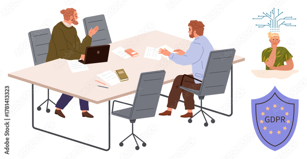 Fototapeta na wymiar - Two professionals at a table reviewing documents, AI concept with a human-thumbs up figure, and GDPR shield. Ideal for teamwork, AI implications, legal compliance, data protection, ethics, privacy.